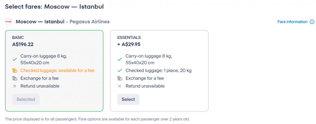 ✔ During the issuing process, the baggage allowance is shown in the fare conditions. Please note: each flight may have a different baggage allowance.